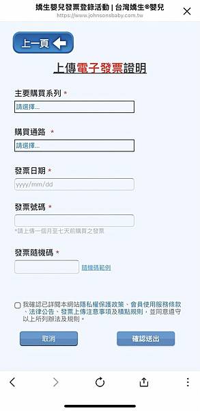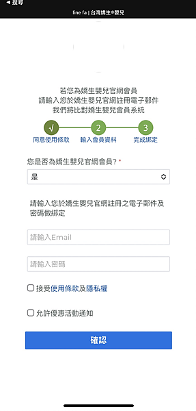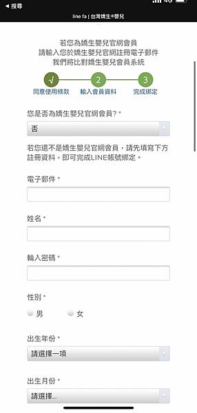 發票登錄步驟 3-2:如尚未為嬌生嬰兒官網會員,請填入註冊資訊,即可完成LINE帳號綁定,並獲得不定期獎勵!