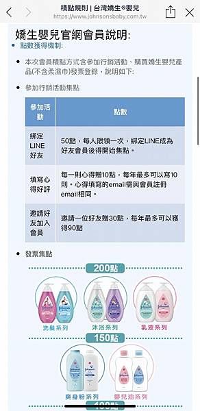 發票上傳獎勵機制:嬌生全品項(不含柔濕巾)皆可積點,如嬌生嬰兒洗髮可獲得200點,小朋友用的嬌生嬰兒沐浴乳之外,也有媽媽愛用的露得清面膜、艾惟諾身體乳與李施德霖漱口水可兌換!