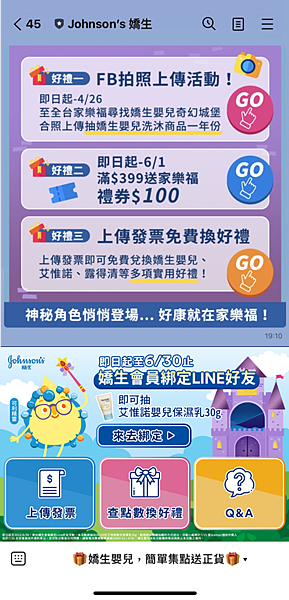 發票上傳步驟 1:進入嬌生嬰兒Line官方帳號並點選“上傳發票”