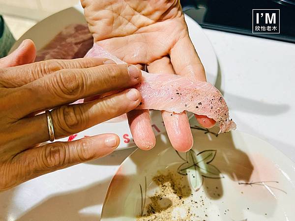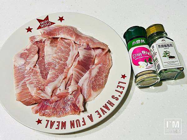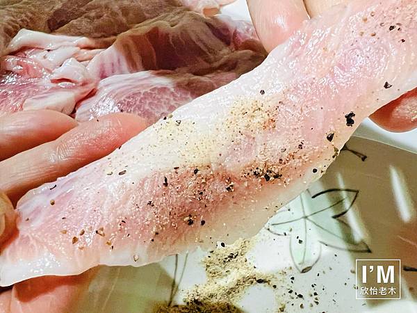 步驟⒈在松阪肉片上均勻抹上白胡椒粉及粗粒黑胡椒