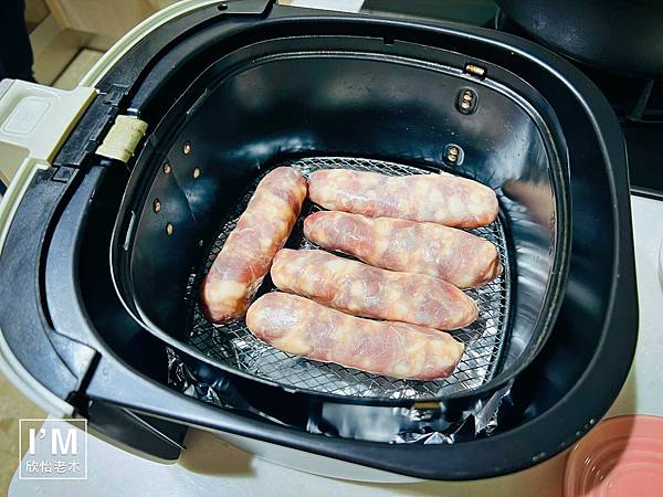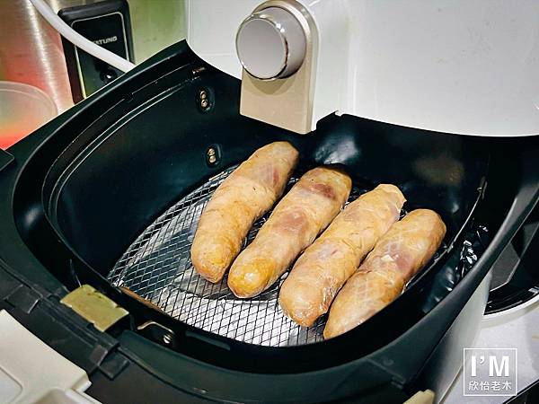 步驟⒈用筷子將高梁酒香腸表面戳些洞,再放入氣炸鍋,第一次設定190度、4分鐘