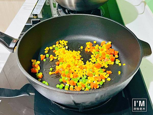 步驟⒋起油鍋,放入切好的四季豆丁及玉米粒拌炒