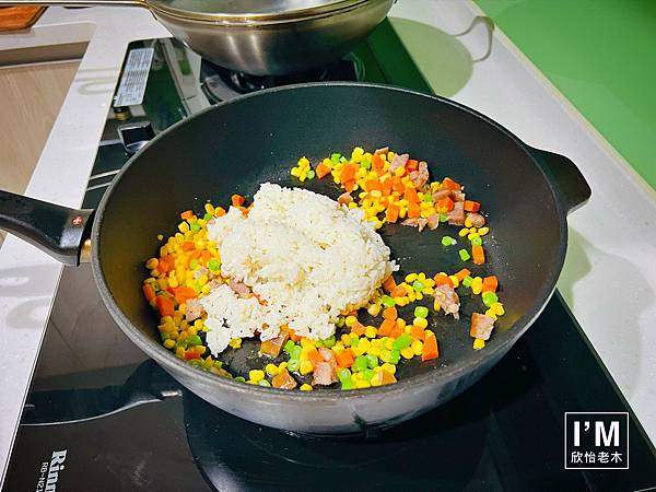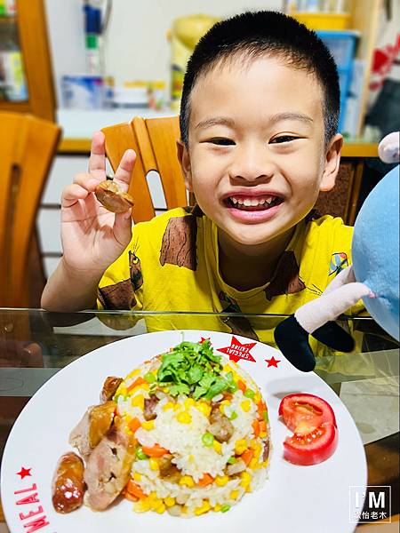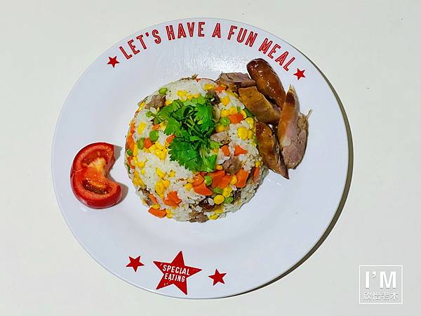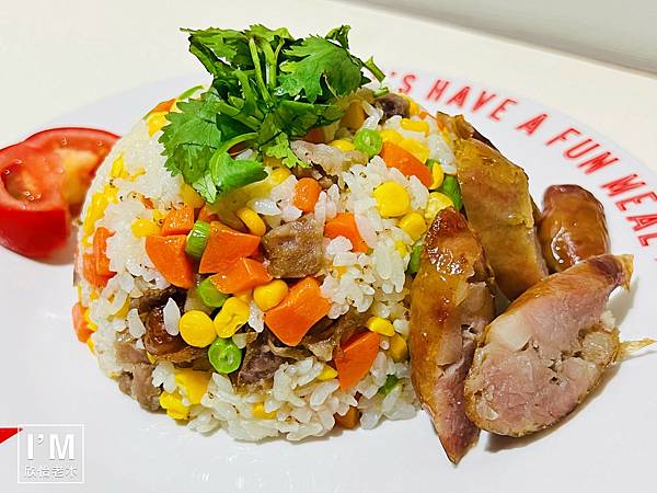 以肉丁取代絞肉,製程中讓腿肉吸收金門58度高粱之香醇酒氣,大口咬下非常過癮!炒飯加入滿滿的香腸切丁,不僅有口感又很對味,紅蘿蔔丁及玉米粒更有畫龍點睛的效果,讓整盤炒飯的顏色很誘人,完全吸引兒子的目光。