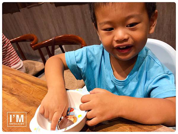🔺瑞瑞很開心的玩著店家提供的兒童碗跟湯匙