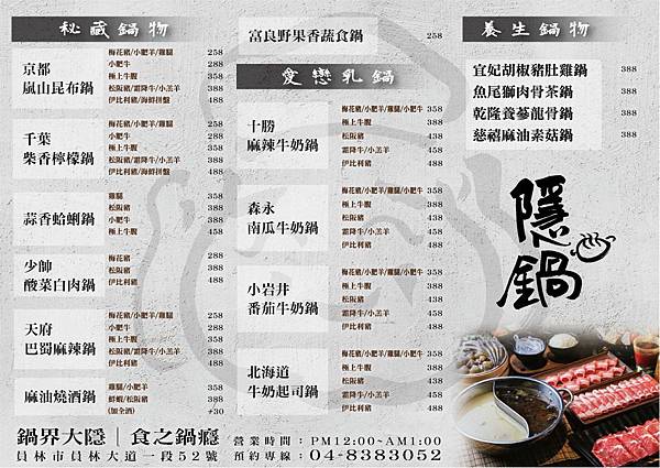 你也跟我一樣愛吃鍋嗎?那絕不能錯過在彰化員林大道一段上的「隱鍋」,這是我follow一段時間的口袋名單,據說主廚曾服務於日本東京大飯店及圓山大飯店,也是蔣宋美齡旅美時的御廚,這威赫的經歷,讓我今天帶家人來彰化玩,終於可以專程來一解相思之愁了。