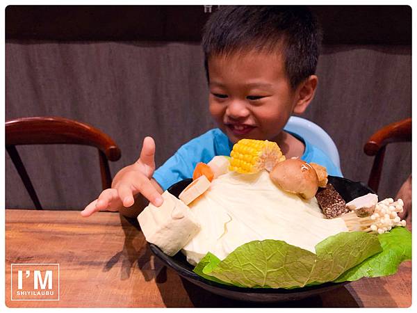 服務人員首先端來的是火鍋所附的菜盤,新鮮的蔬菜在燈光照射下顯得格外吸引人,也增加了食慾,真想快點把它們丟到鍋中熬煮。對了,如果吃不夠也能加點喔!(來人啊我的鍋勒)